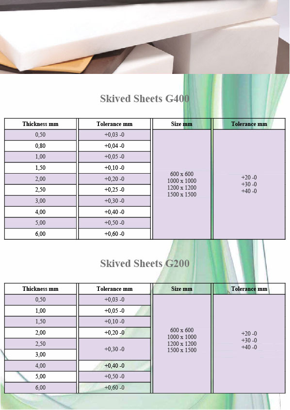 Technologies available with our principle provide options among a wide range of moulded or skived sheets, in virgin PTFE as well as compounded PTFE.